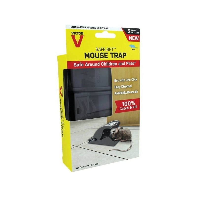 Safe-Set mouse trap offers a powerful and effective 100% catch and kill. Easy to set with a one-click design, they are refillable and reusable. No touch mouse disposal is easy and safe to use around childern and pets. The robust plastic design makes cleaning simple. Pre-baited with proved Victor engineered attractant, the bait hood eliminates chance of bait theft.