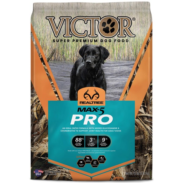 Designed with hard-working dogs in mind, VICTOR’s REALTREE MAX5 PRO provides an ideal ratio of 30% protein and 20% fat. This multi-protein formula features beef, fish, and duck meals along with added glucosamine and chondroitin to support healthy cartilage and reduced hip and joint inflammation, keeping your dog running all season long.