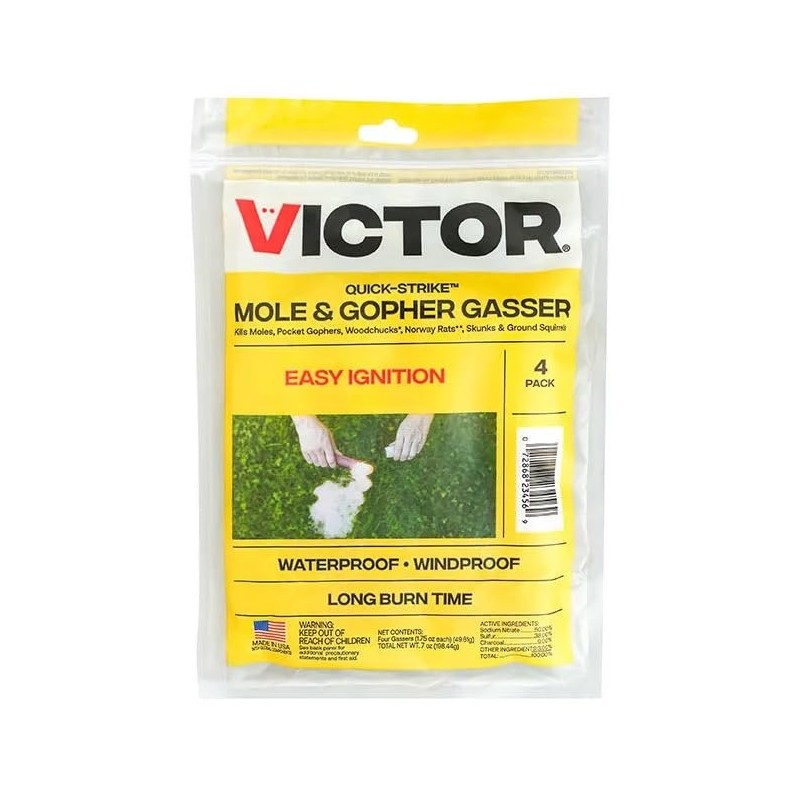Are you tired of nuisance animals digging up your lawn and destroying your yard? Victor Quick-Strike Mole & Gopher Gasser is here to help! Quick-Strike is designed to kill several problematic pests, including moles, gophers, woodchucks, Norway rats, skunks and ground squirrels. The compact size allows for easy placement in underground tunnels where many of these pests live. Plus, this pack includes four gasser sticks to eliminate your problem in no time.