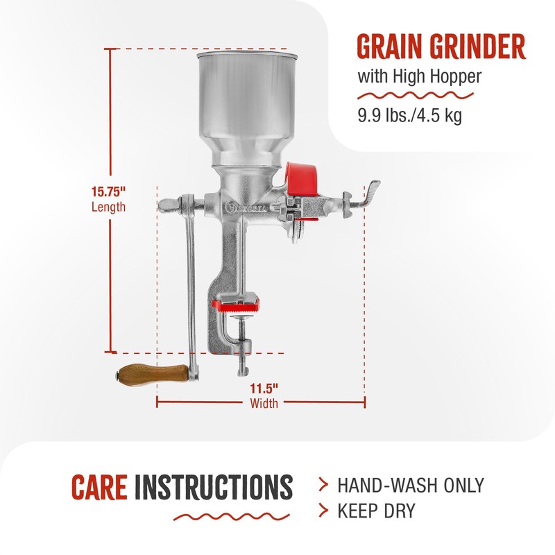 - PREMIUM CAST IRON: This grain mill features a durable cast iron hand crank with a wooden handle, an easily adjustable clamp, high-performance discs made of anti-erosion white iron for maximum performance on all types of grain, and nonslip rubber to protect your surfaces and prevent slipping.