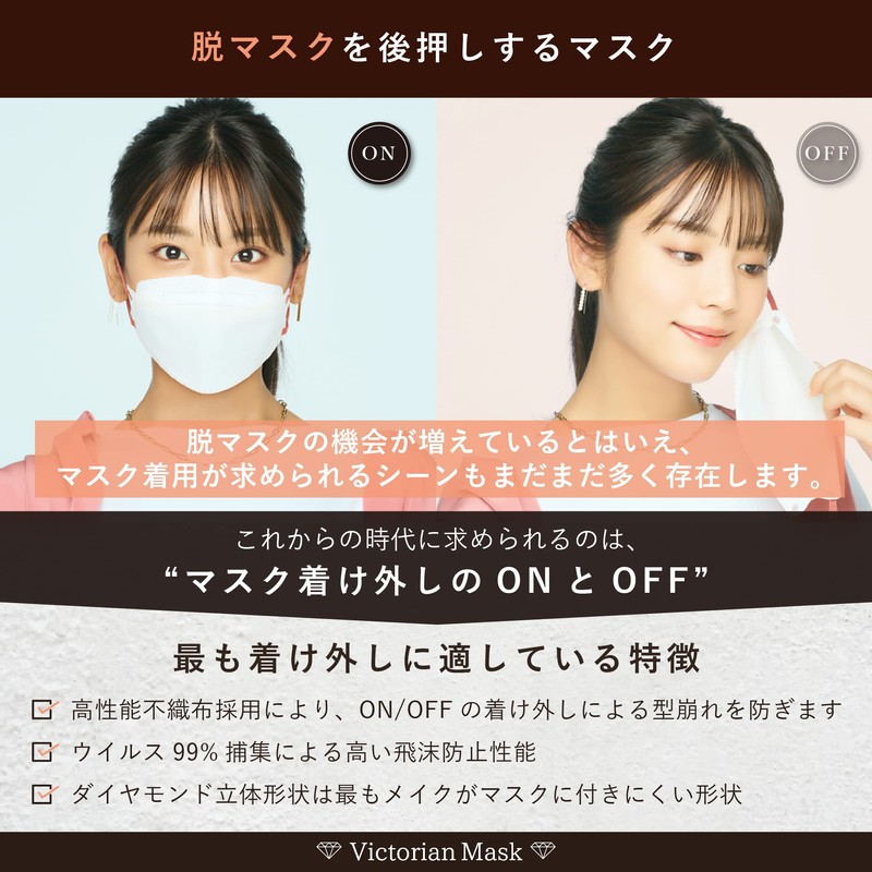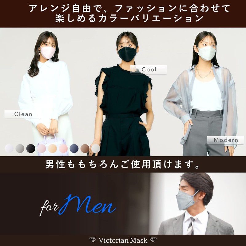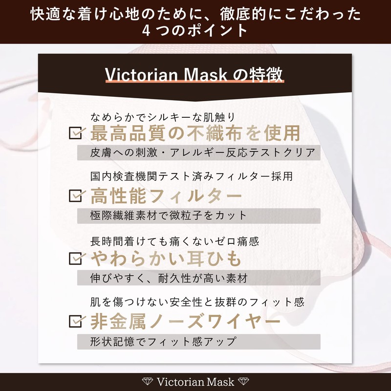"Victorian Mask" is a high-quality mask that is designed based on human body engineering, making it easy to breathe and does not attract lipstick or makeup, making it safe and secure.