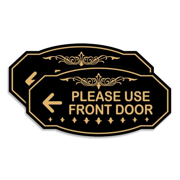 Victorian Please Use Front Door (Left Arrow) Sign (Black Gold) - Large 2 Pack