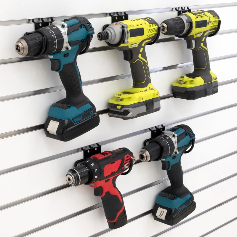 - HEAVY-DUTY - This pack includes our Victory Garage Heavy Duty Drill Hooks. All hooks can be used with Pegboard and Slatwall. These utility hooks are made from heavy-duty steel wire and can be used to hold medium to large-sized drills. There is a distance of 4.25” between the two wires on the hook, and they stick out 3” from the wall.