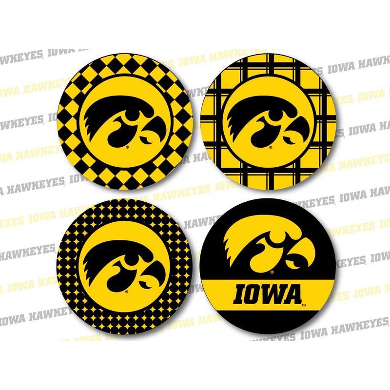 - COASTERS - These fun University of Iowa coasters have edge to edge full-color graphics, they are 4 inches round and 1/16th inches thick. They have a polyester top and an open cell black rubber bottom to keep the coaster from slipping while also absorbing excess moisture.