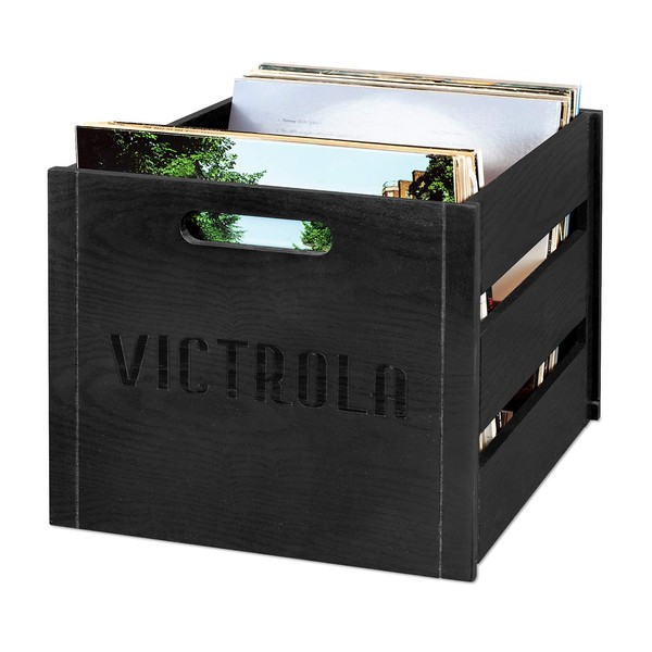 Victrola Wooden Record Crate – Tabletop Vinyl Album Holder, No-Tool Assembly, Holds Over 50 Records, Real Wood Construction, Elegant Design (Black)