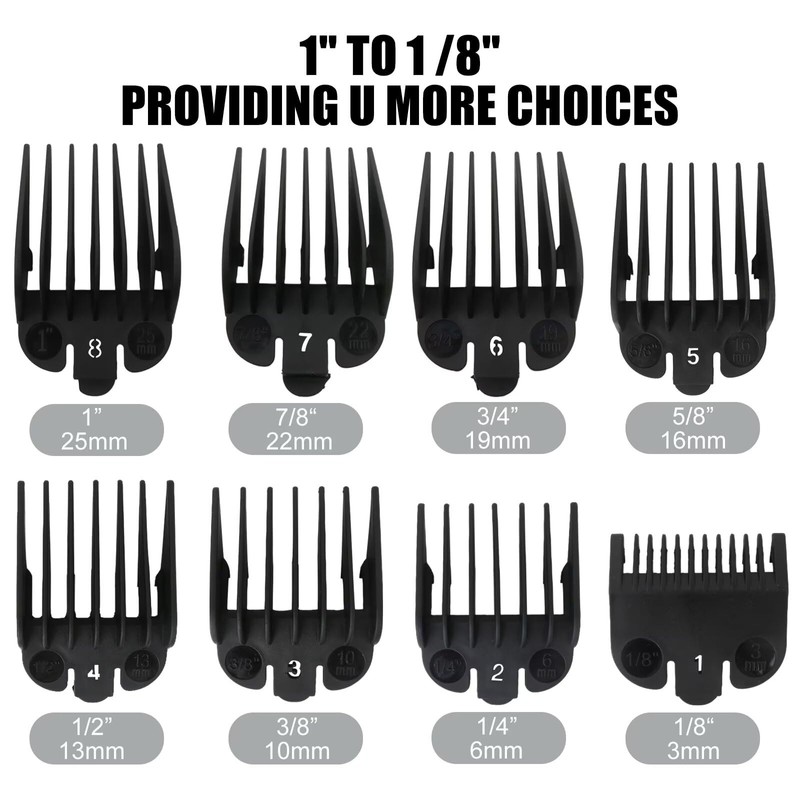 ☛ The universal clipper comb set includes 8 sizes: 1/8”, 1/4”, 3/8”, 1/2”, 5/8”, 3/4”, 7/8” and 1". Can meet your requirements for creating various hairstyles.