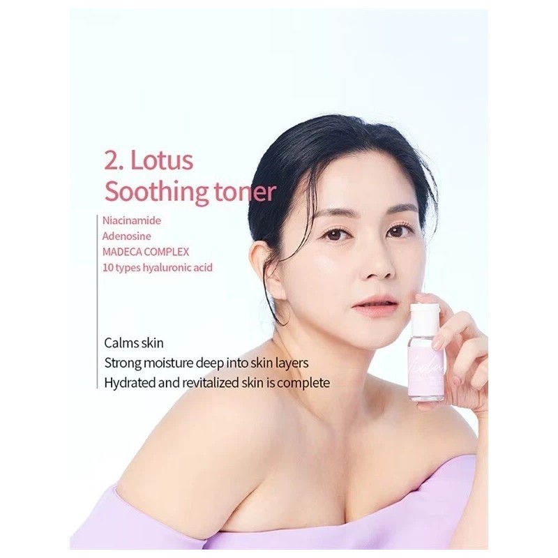 2. Lotus Soothing Toner: Enriched with niacinamide, adenosine, and MADECA complex, this toner calms your skin and delivers strong moisture deep into the skin layers. Your skin feels hydrated and revitalized.