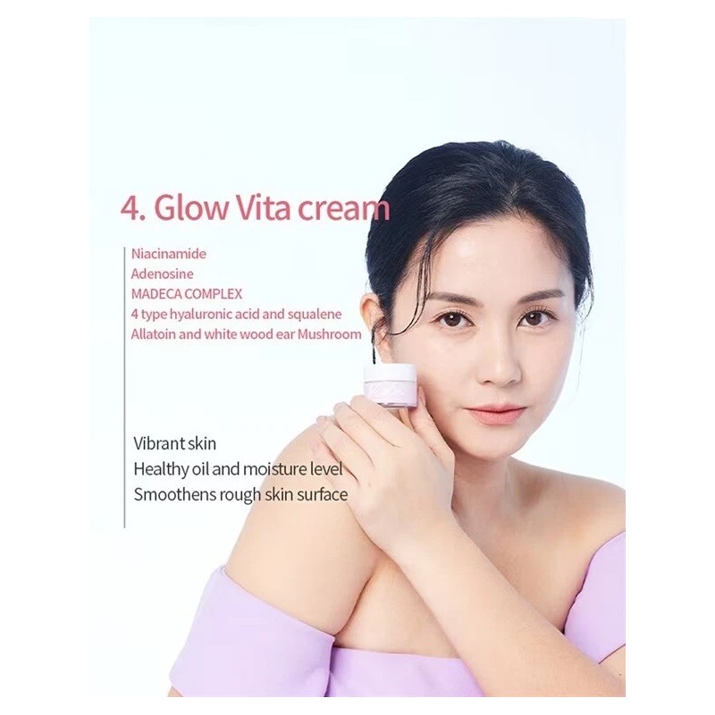 4. Glow Vita Cream: Infused with niacinamide, adenosine, MADECA complex, hyaluronic acid, squalene, allatoin, and white wood ear mushroom, this cream promotes vibrant skin and maintains a healthy oil and moisture level. It also smoothens rough skin surface.