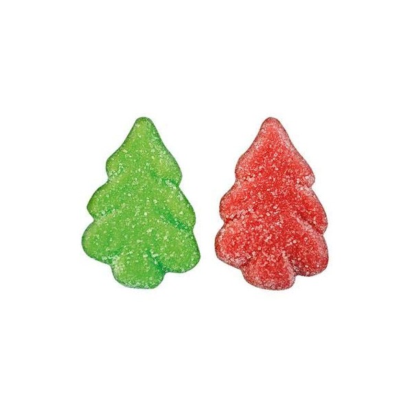 - Red and green gummi Christmas trees with a sugar sanding coating.