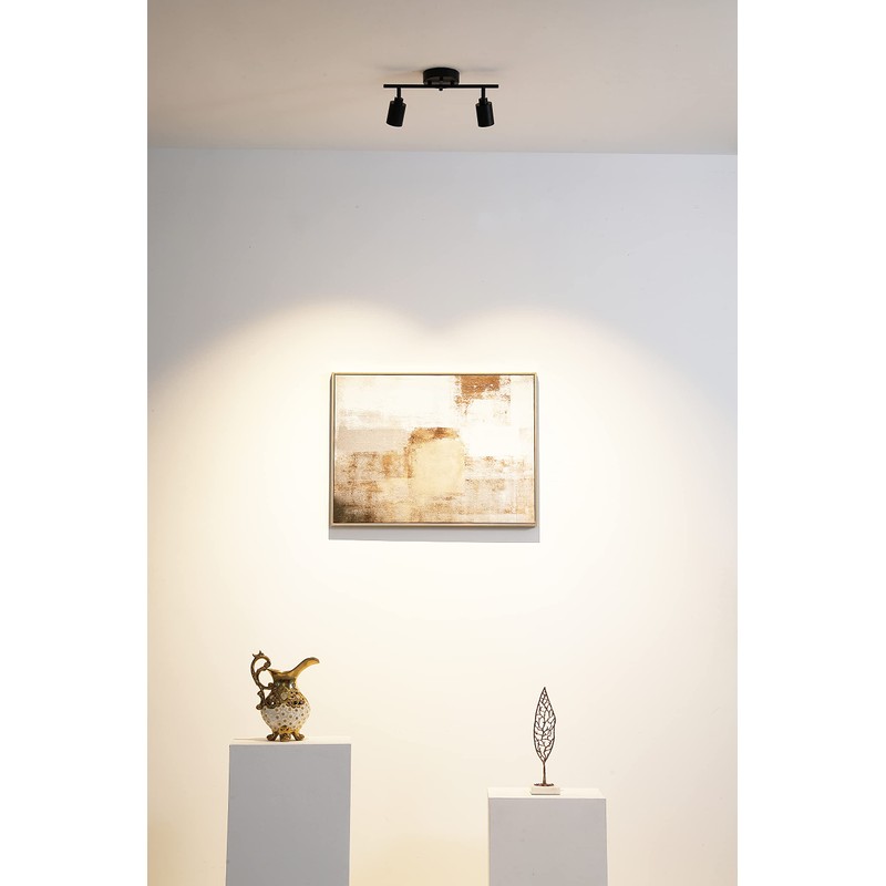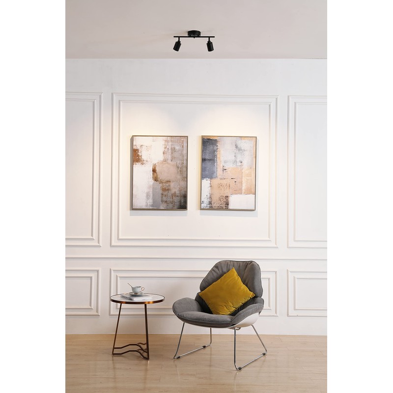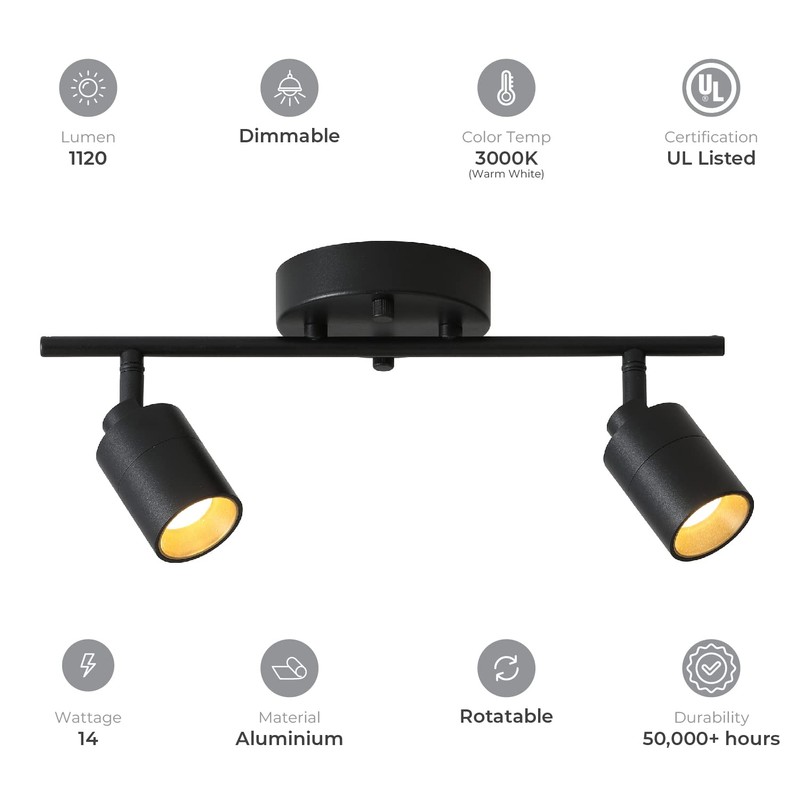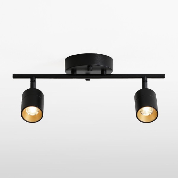 - INTERIOR TRACK LIGHT: This Dimmable fixed rail track light features two rotating spot lights dropping down from a black aluminum track. The lens cap of each head is accented by brushed gold for modern look.