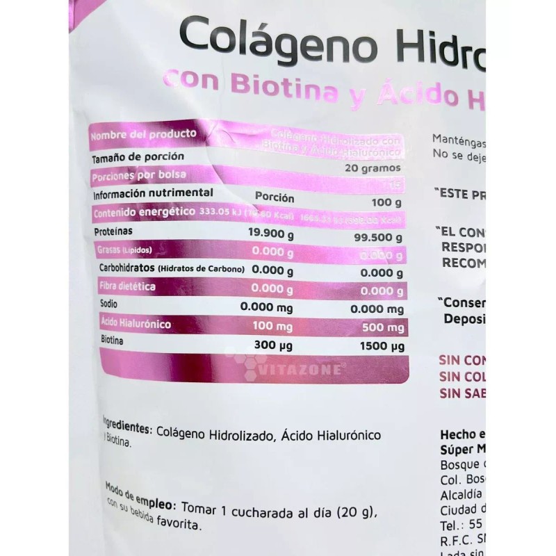 - Ingredientes: Colágeno hidrolizado, Biotina y Acido Hialuronico
