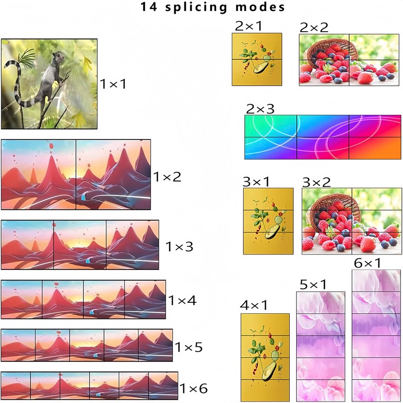 - ▶This Video Wall Controller 2x3 Support 14 splicing modes: 1×1 1×2 1×3 1×4 1×5 1×6 2×3 2x2 3x2 6×1 5×1 4x1 3×1 2×1, easy to handle, plug and play;