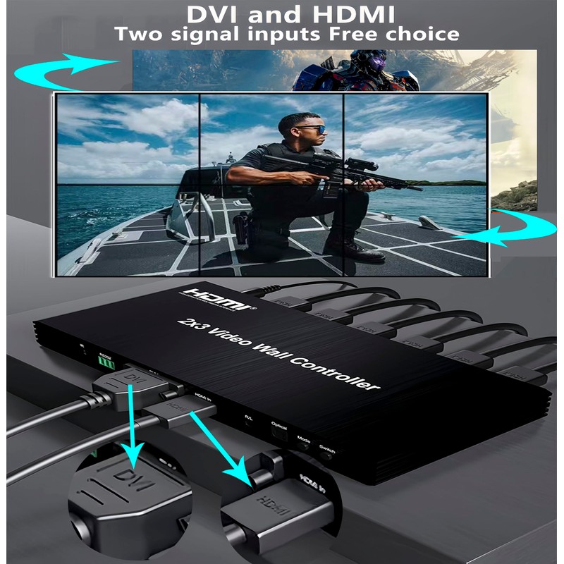 Video Wall Controller 2x3 1080P HDMI Video Wall Controller 2x2 2×1 1x2 3x2 1×6 6×1 5×1 4×1 14 Splicing Modes 1HDMI/1DVI in 6HDMI Out TV Wall Splicing Processor Support IR RS232 3.5mm Audio Out etc