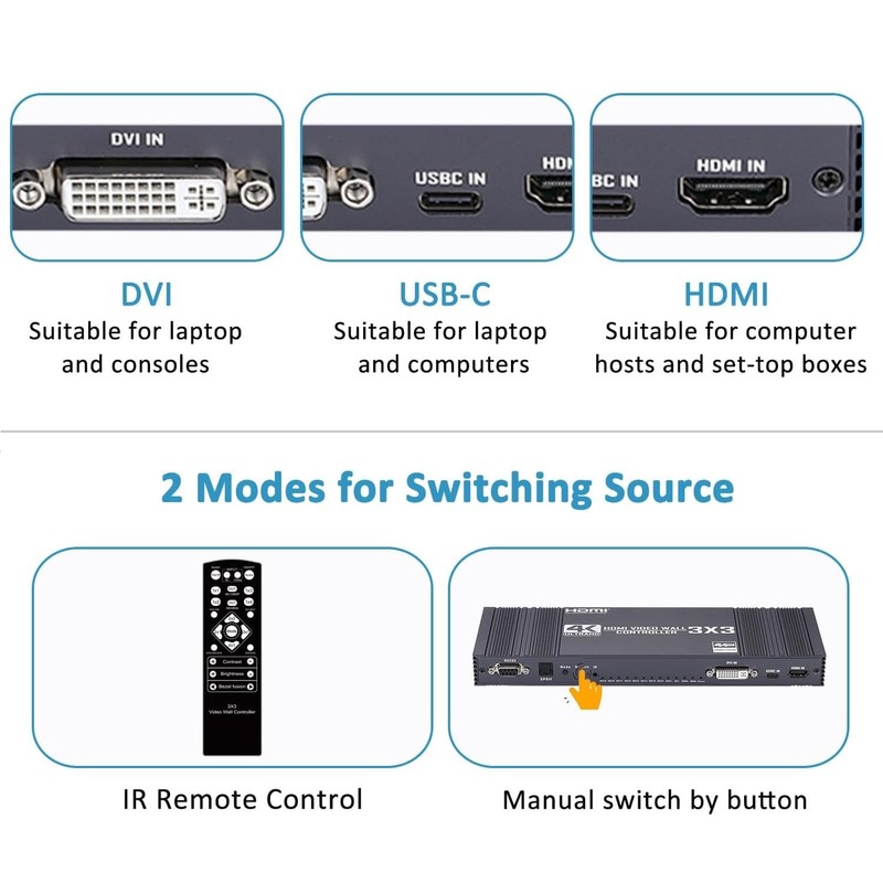 Video Wall Controller 3x3, 4K HDMI & USB-C & DVI Input 17 Splicing Modes,RS232,IR,180° Rotate, PCM Audio Output for 9 Channel Video Wall Processor