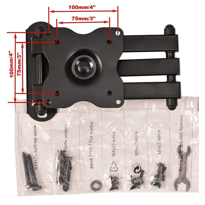 - Compatible with VESA (mounting hole pattern) 75x75(3"x3") or 100x100(4"x4"). Common hardware pack included in the package
