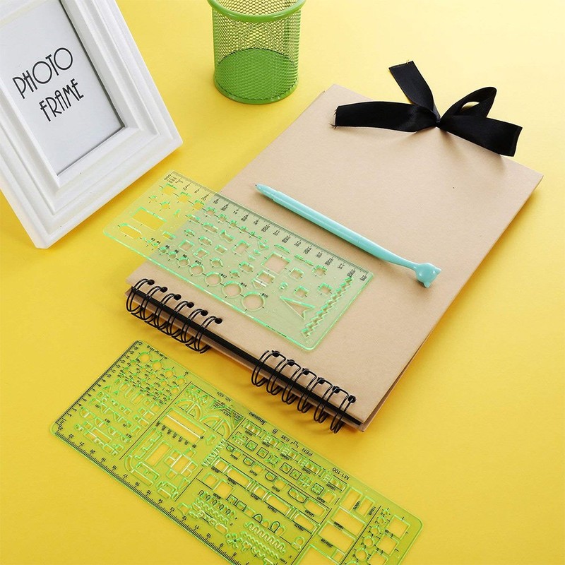 Universal rulers and stencils, with different geometric patterns, such as hexagon, circle, ellipse, triangle, etc. It is really an ideal learning assistant; different shapes to meet your different needs.