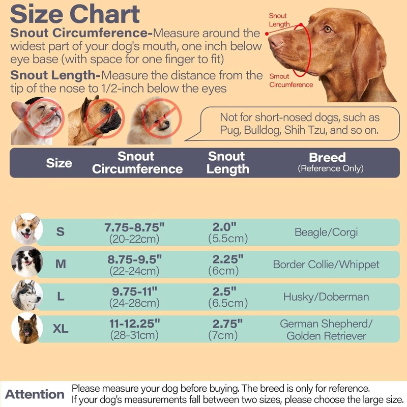 - Size description: This S dog muzzle is suitable for dogs with a muzzle circumference of 20-22 cm (7.75-8.75 inches) and a muzzle length of about 5.5 cm (2 inches). Please carefully measure the circumference and length of your dog's muzzle before purchase to ensure that the dog muzzle you buy fits your dog perfectly