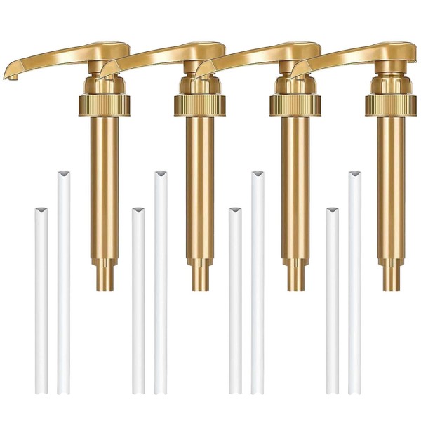 VIDSTW Pack of 4 Dosing Pump Dispenser Reusable with 4 Long Straws and 4 Short Straw Syrup Dispenser Pump Dispenser Syrup for Family, Cafe, Milk Tea Shop, Restaurant (Gold)
