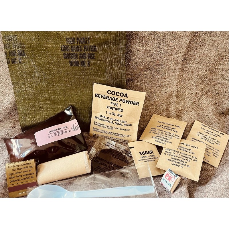 Our kit is based on an original Chicken and Rice LRP in our collection. It’s includes the chicken and rice freeze dried entree inside, cocoa beverage powder, spoon, match book, toilet issue, two coffee type I sachets, creamer sachet, sugar, gum and enriched chocolate disc.