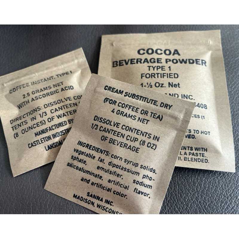 Using original unused LRP bags, with fully edible contents inside and reusable packaging. The freeze dried entree, coffee sachets, creamer sachet, cocoa powder sachet, spoon pouch are all refillable and reusable without sacrificing authenticity, using resealable foil lined craft sachets. With a few items from the store you can refill and reuse this kit over and over again.