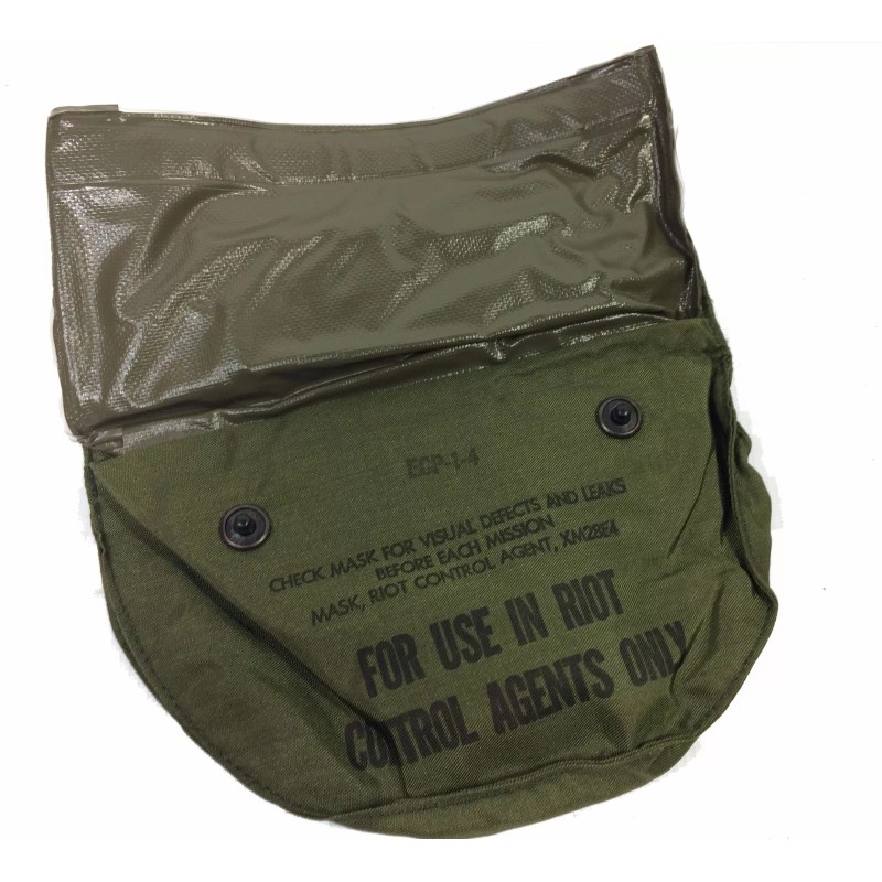 Gas mask bag, XM28E4; Vietnam dated "Tunnel Rats". Originally for small emergency gas masks used in riot control, the size and construction of this bag make it a perfect camera bag for river rafting. Fold-over rubber inner is secured by two lift-a-dot fasteners to hold your valuables dry and secure. Inner bladder is protected by a nylon outer cover that has 2 ALICE keepers attached so bag can be worn on your belt.