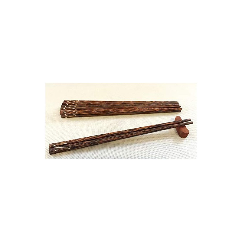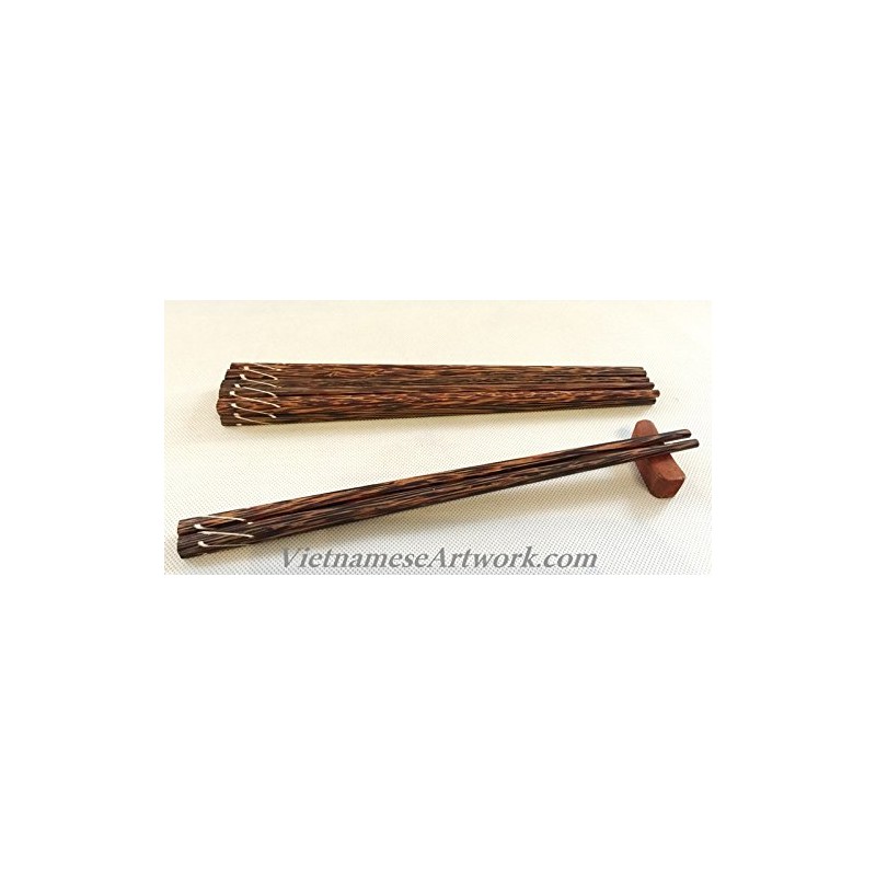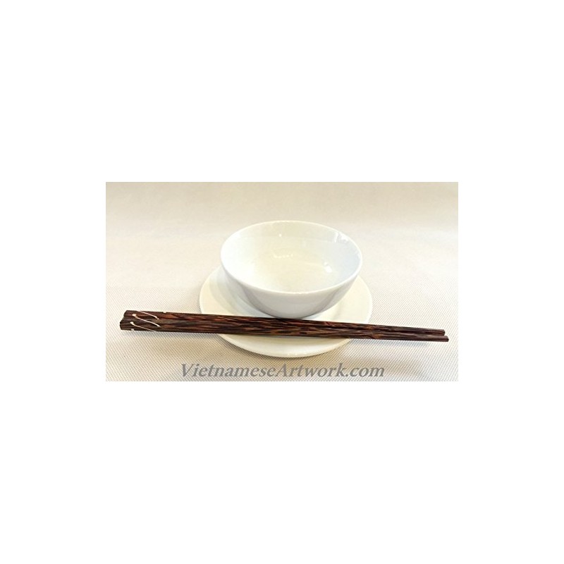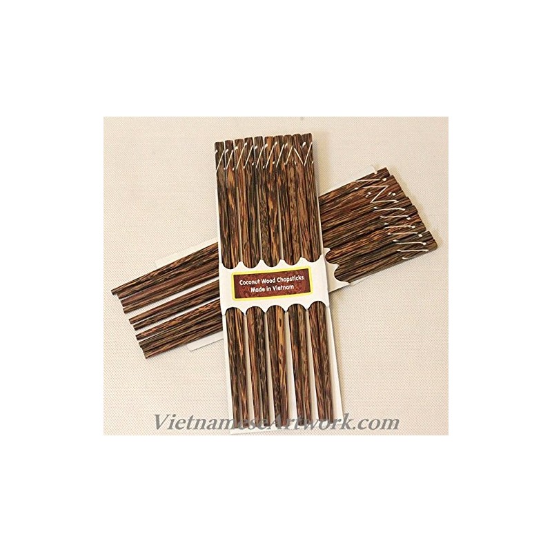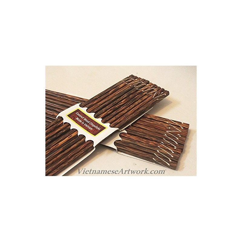 Do you eat with chopsticks? We are proud to introducing the safe chopsticks for you and your family to use everyday, Coconut Wood Chopsticks. The chopsticks are hand made from coconut wood which is abundant in Vietnam. Coconut trees are the best description of the Vietnamese way of life. People drink the coconut juice, turn coconut flesh into food and candies, use the coconut leaves for roofing and the wood for construction. Not to mention the coconut shells become household utensil (tea pots, bowls and cups) and the coconut wood becomes beautiful chopsticks which are natural, safe and the most eco-friendly products. They are not only beautiful with natural coconut "veins" but also durable and stand the cooking high heat. If you use chopsticks everyday for food, try the coconut chopsticks. They are chemical free, safe, affordable, durable compared to the Chinese made chopsticks which the bamboo was treated with toxic chemical to make them white. Give yourself and your family the gift of being healthy starting with these coconut chopsticks. More product information: The price if for one package which contains 10 pairs (twenty chopsticks) Each chopstick is 10" high with elegant white decoration on top. Color: dark caramel, natural wood color with streaks of the darker veins. The chopsticks holders are not included! Please let us know if you buy them as gift, we will wrap them in rice paper without extra charge.