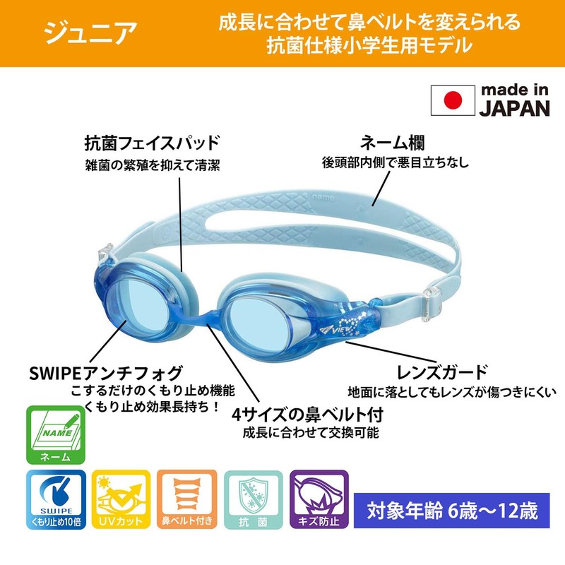 VIEW V722JSA BL Swimming Goggles, Made in Japan, For Elementary School Students, 6 - 12 Years Old, Anti-Fog, SWIPE UV Protection, Antibacterial Specifications