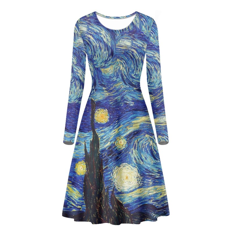 Viewamoon Starry Night Print A-Line Dress for Women XX-Large - Van Gogh Blue High Waist Elegant Flared Casual Dress - Comfortable Lightweight Stylish Swing Knee Length Skirt