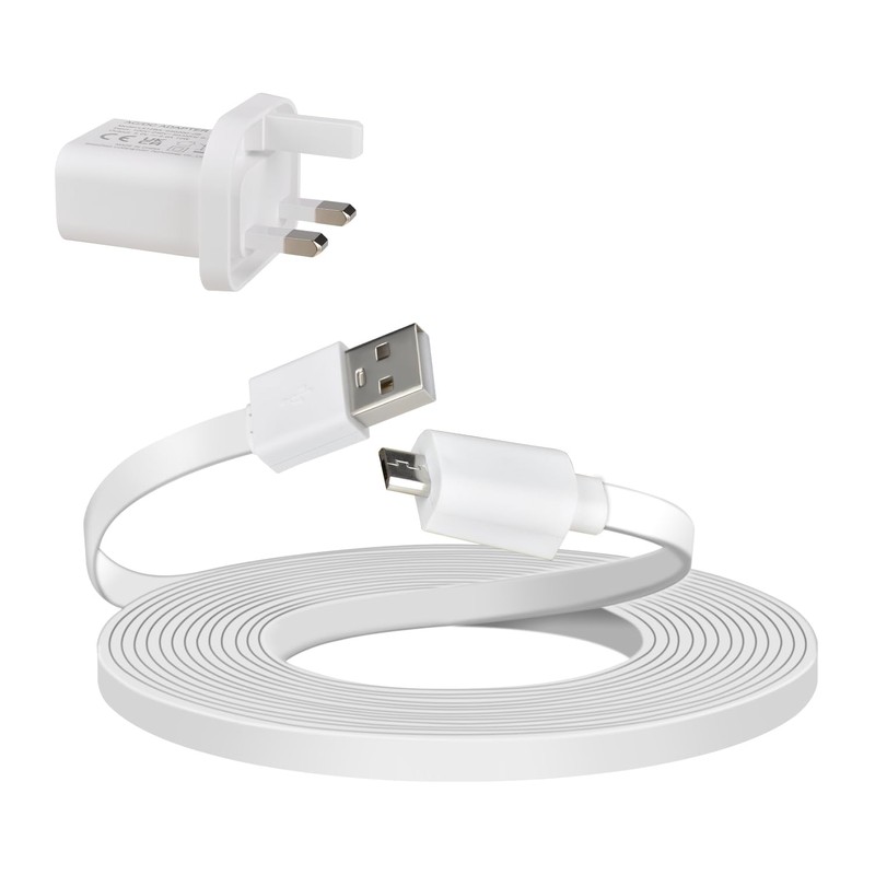 • 6 Metres Long. The charging cable is 6 Metres long. You can easily plug it into a power outlet inside or outside the house, even if the camera is far away from the outlet. Makes it possible to connect it to the outlet inside or outside your house.