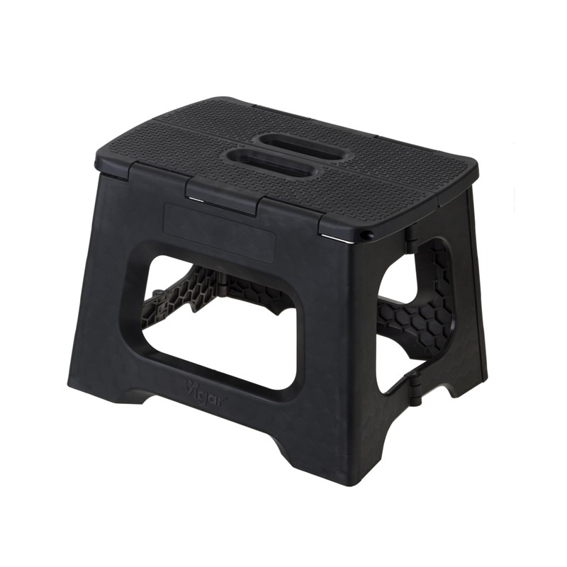 Vigar's Compact Foldable Stool is the perfect addition to your home's kitchen, bathroom, or any space where a little extra height is helpful. Made from durable polypropylene built to last, this multipurpose step stool lets you clean the top of the refrigerator, reach high cabinets, and change light bulbs with ease. A strong textured base prevents slippage and stabilizing, non-slip rubber feet keep the stool in place. Compact and portable, an internal double handle makes for easy carrying and hanging storage. Simply folds and unfolds with a single, effortless movement. Holds up to 330-pounds and measures 12-1/2-inches long by 10-1/4-inches wide by 9-inches high when unfolded. Stool measures just 1-1/4-inches wide when folded for easy storage in your cleaning closet. To clean, wipe with cloth and water as needed.