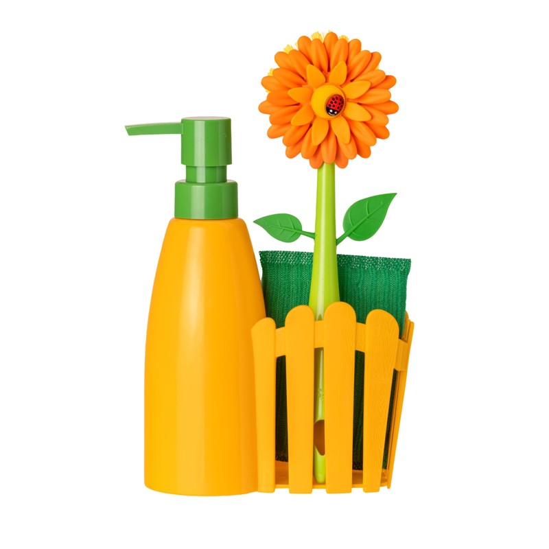 Vigar Flower Power Kitchen Soap Dispenser Set, Dish Soap Dispenser with Sponge Caddy and Dish Brush, Perfect Kitchen Sink Caddy, Orange, Green