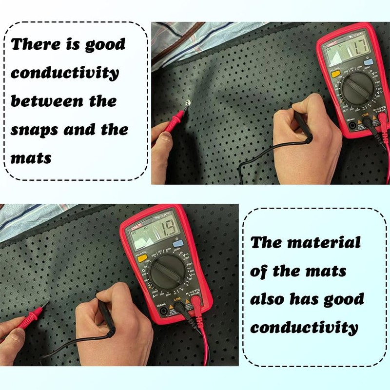 The grounding mat is made up of Conductive Carbon Leatherette . It has good electrical conductivity so that they can form a conductive system that balances chaotic current, prevents static electricity, improves sleep, reduce stress and relieve pain.