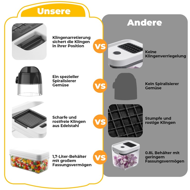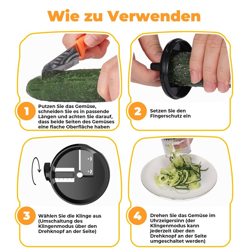 - MULTIPURPOSE VEGETABLE CUTTER The vegetable chopper comes with 2 cutting blades and a 4-in-1 hand spiral slicer, which allows you to efficiently cut different ingredients into even slices, strips, cubes or thick strips without technical effort. Perfect for onions, potatoes, cucumbers, courgettes, carrots and much more. Say goodbye to tedious and boring preparations and enhance your family's dining experience with ease