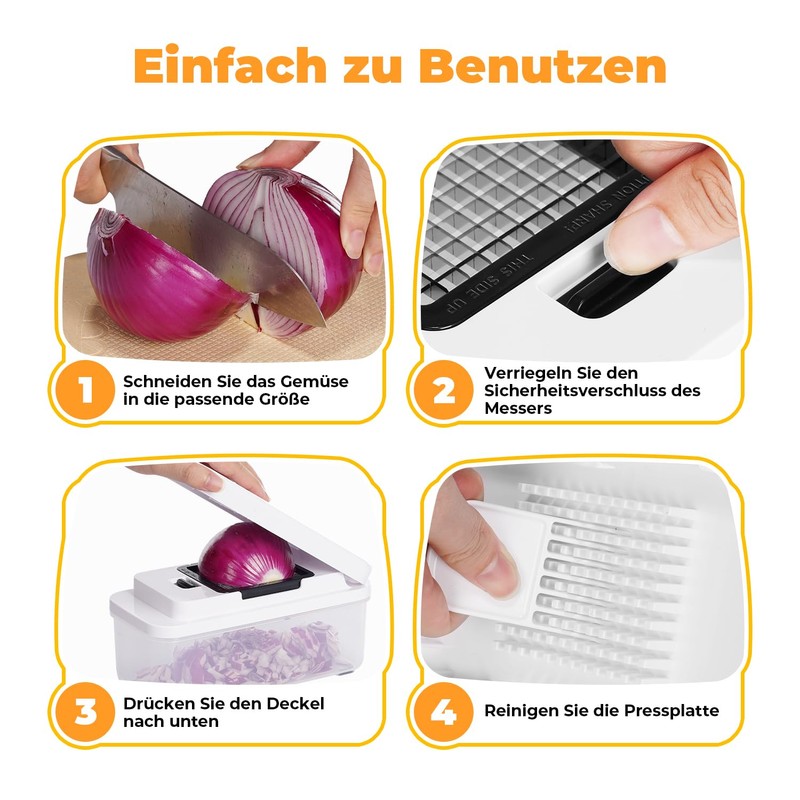 - USER FRIENDLY DESIGN Our dice cutter adopts ergonomic design to ensure comfort and safety when using. The safety lock keeps the blade securely in place, while the anti-slip strip on the bottom provides stability and makes cutting easier