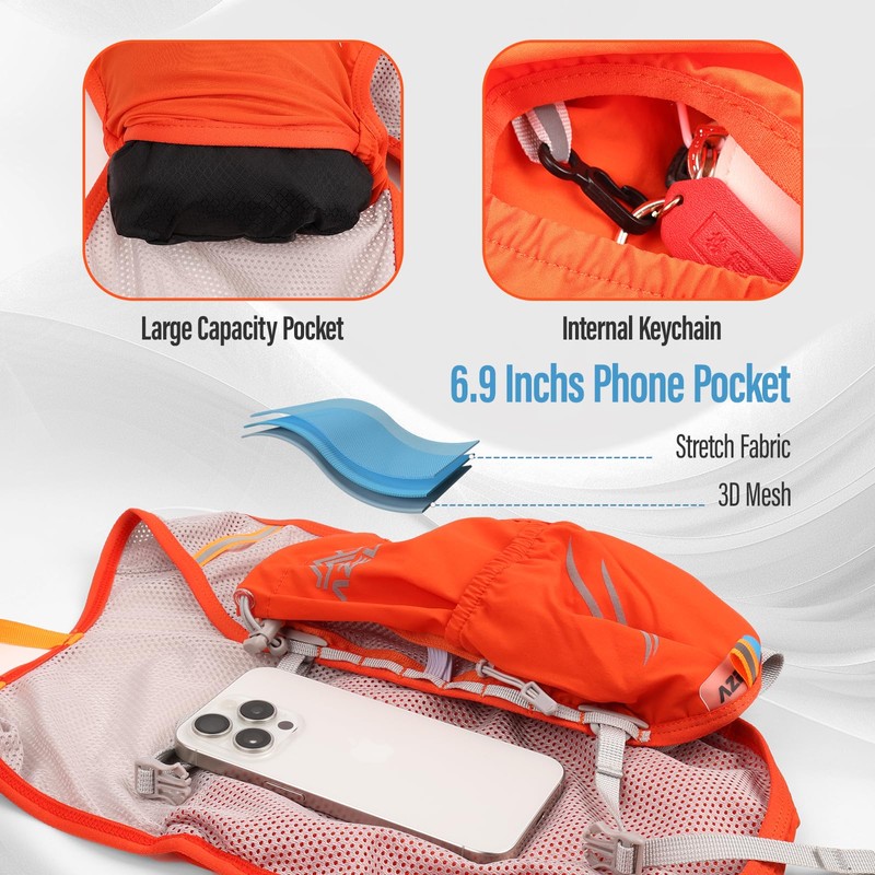 - 【Versatile Running Backpack】The running backpack features strategically placed pockets, including a secure phone sleeve, quick-access snack compartments, and elastic storage for essentials like keys or energy gels. The streamlined design keeps gear organized without sacrificing mobility during runs, hikes, or travel.