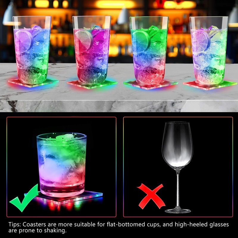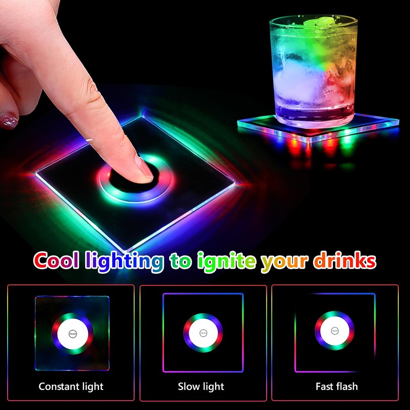 - 8-piece set of LED coasters, shiny and fashionable: this set of 8 square, colourful LED drink coasters contains 6 integrated LED lights and offers a variety of colour options to meet your different needs. Whether it's cool white light or colored LEDs, it gives your drinks a sparkling atmosphere, enhancing the atmosphere of parties and gatherings.