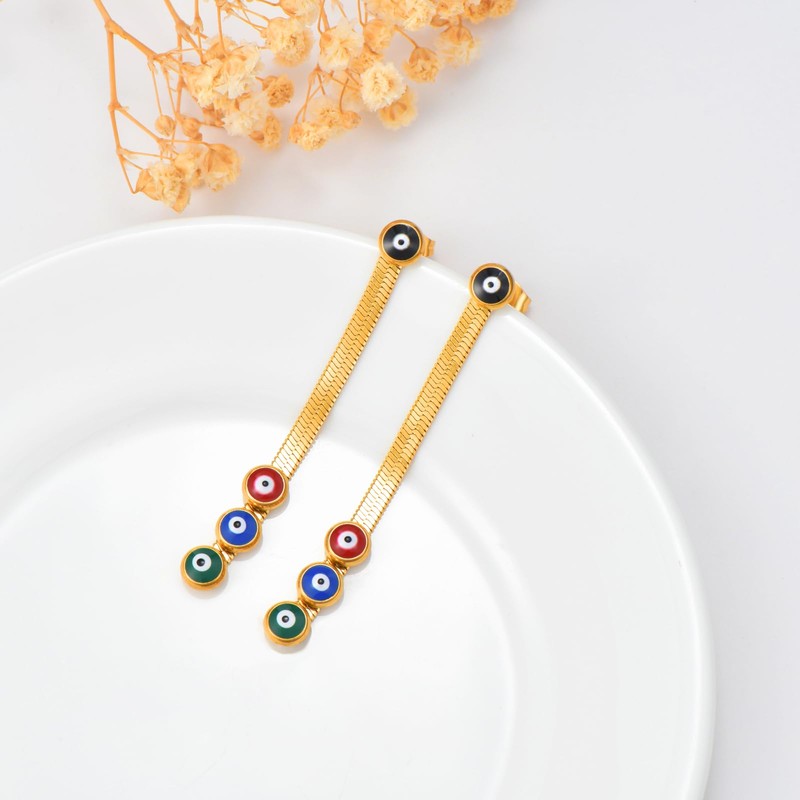 - 👁Evil Eye Long Dangle Earrings👁: Evil Eye Earrings is designed to ward off negative energy and protect you from evil forces, ensuring a safe and harmonious aura. Attract good luck with these fascinating cute demonic eye earrings and lift your style. A seductive evil eye pattern, gracefully hanging in a gold-plated flat snake chain.