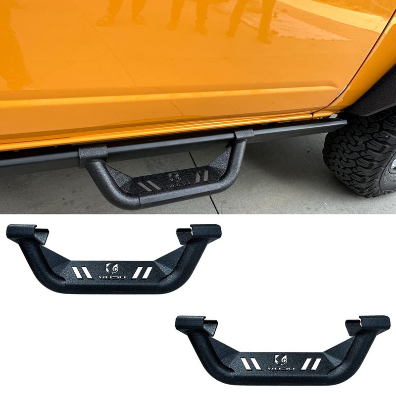 - [Quick installation design]:Unique pinch clamping system allows a flexible installation way on the rock rail. This replacement for Ford Bronco side steps has a one-piece design that can be installed and removed in seconds for your cross-country trip. No need to drill holes or cutting, and no damage to the car