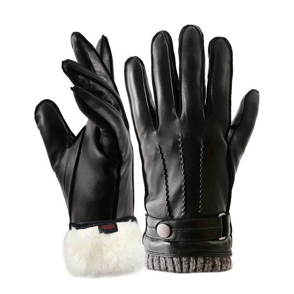 VIKIDEER Super Warm Fur Gloves Mens Leather Gloves Real Rabbit Fur Lined Touchscreen Driving Gloves Black Large