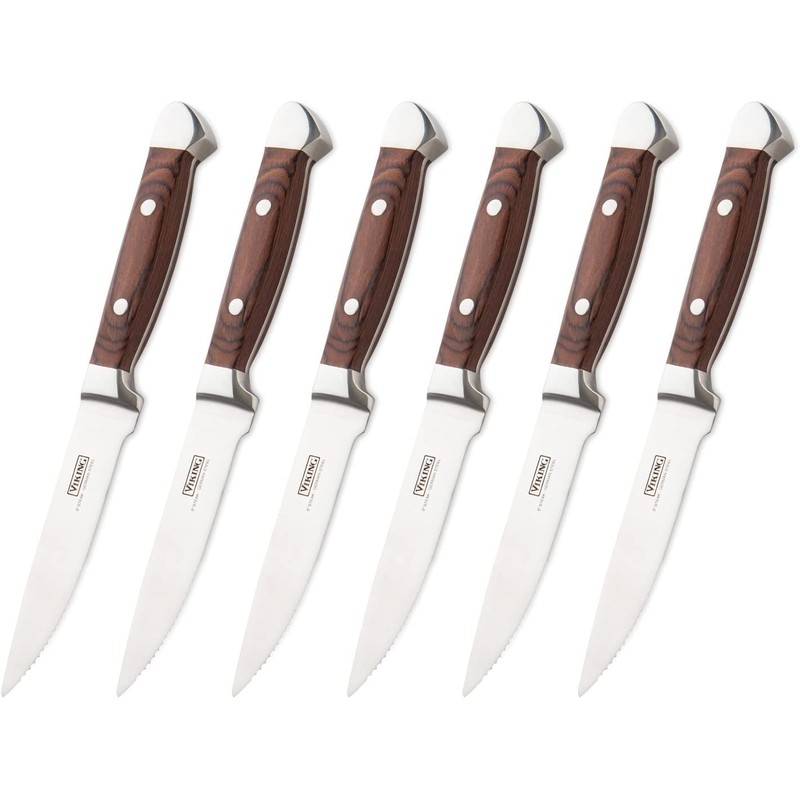 The partially serrated blades of each Viking Professional steak knife easily slice through thick or thin cuts of meat, just as expected from a traditional steakhouse style knife. Each restaurant grade knife is expertly honed from durable German stainless steel - the standard for quality blade material. The unique Pakka wood handles are double-riveted around the full tang construction with bolster for exceptional balance, control and comfort. Each water and stain resistant handle has a unique design due to the construction of this renewable material.