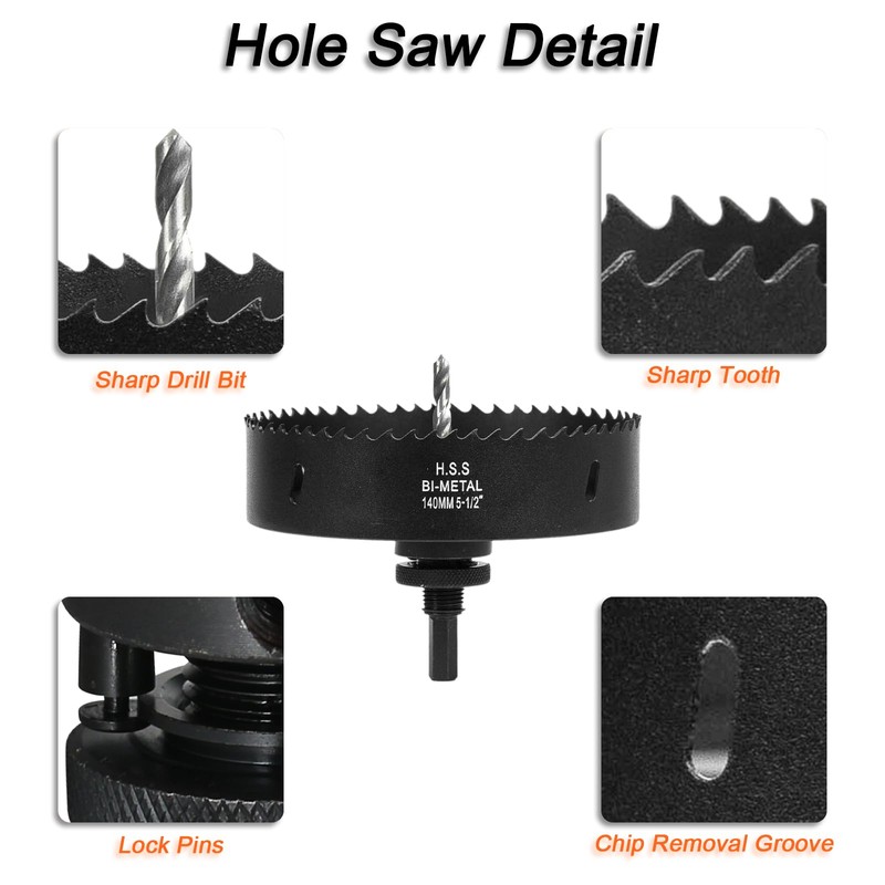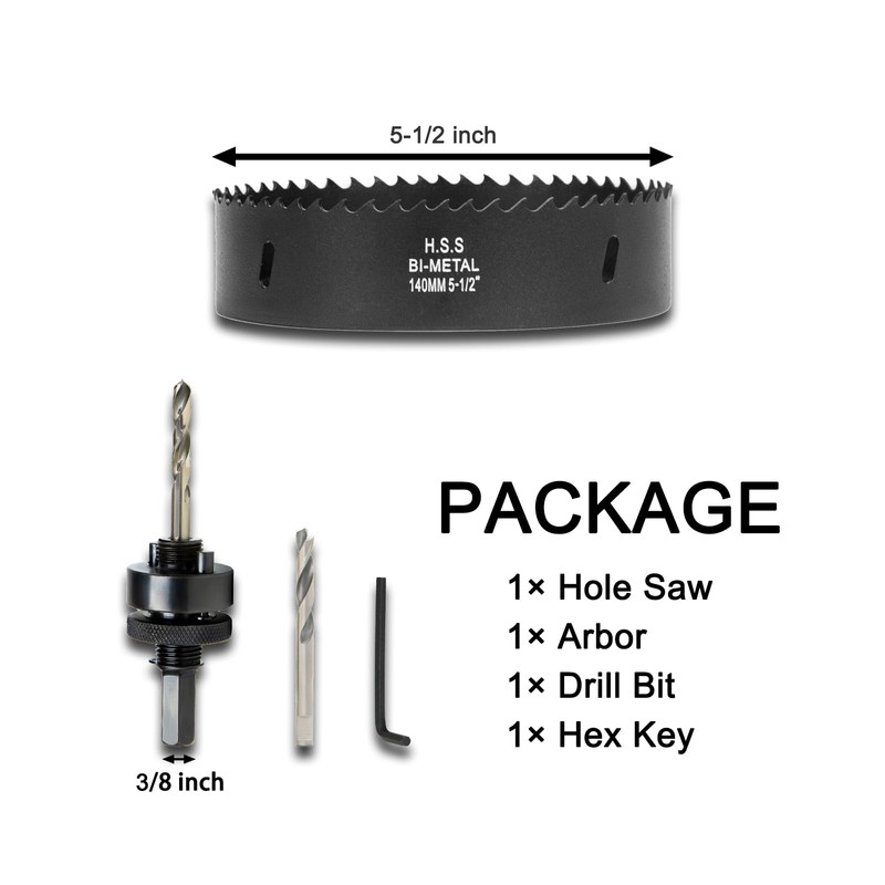 - Package Includes: 1 pc 5-1/2" hole saw, 1 pc arbor with drill bit, 1 pc pilot drill bit (replacement), 1 pc hex key