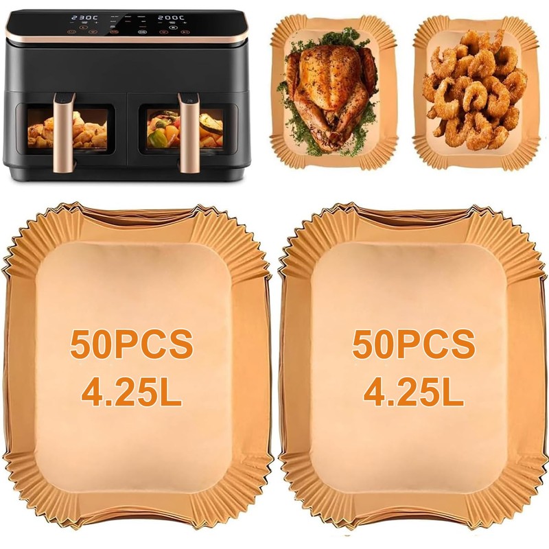 VIKKI 100 Stück Airfryer Backpapier für Heißluftfritteuse COSORI 8,5L, Rechteckig Airfryer Backpapier für COSORI Heißluftfritteuse 2 Kammern Dual Zone Airfryer Air Fryer XXL 8,5 L