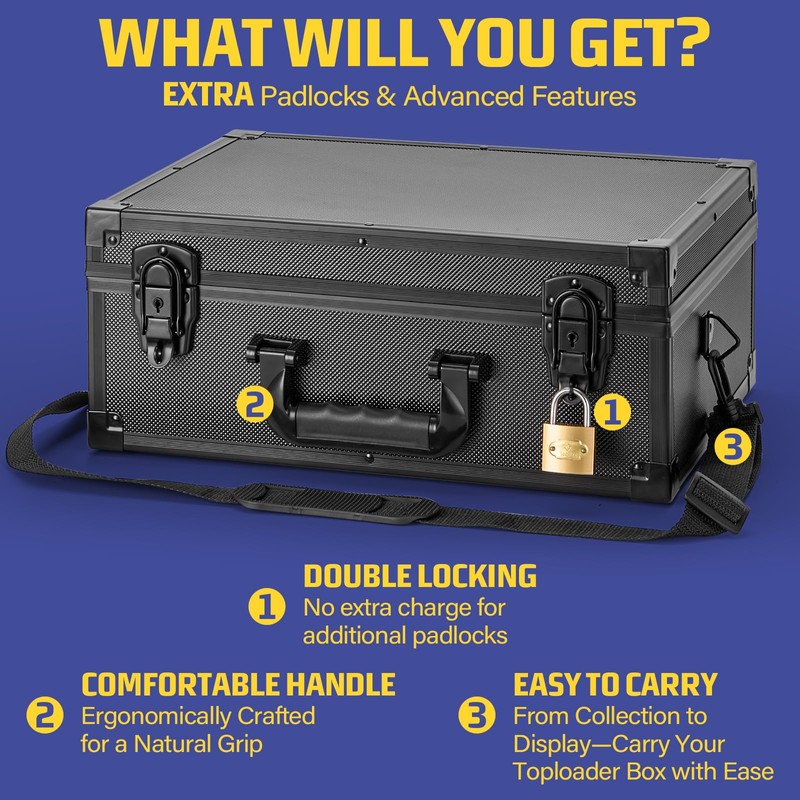 Vilcjson Toploader Storage Box - Card Organizer for 3" x 4" 35pt Rigid & Magnetic Card Holders, Sports Card Case with Three Lock, Trading Cards Hard Case with Shoulder Strap for 600+ Top Loader Card
