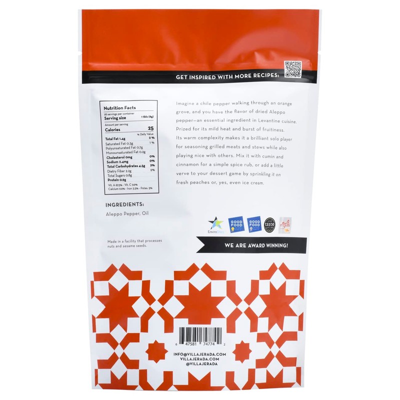 Villa Jerada, Aleppo Pepper (Red Chile Seasoning Flakes) - Bright, Savory & Fruity Spice of The Mediterranean’s Levant Region, 7oz/200g Pouch