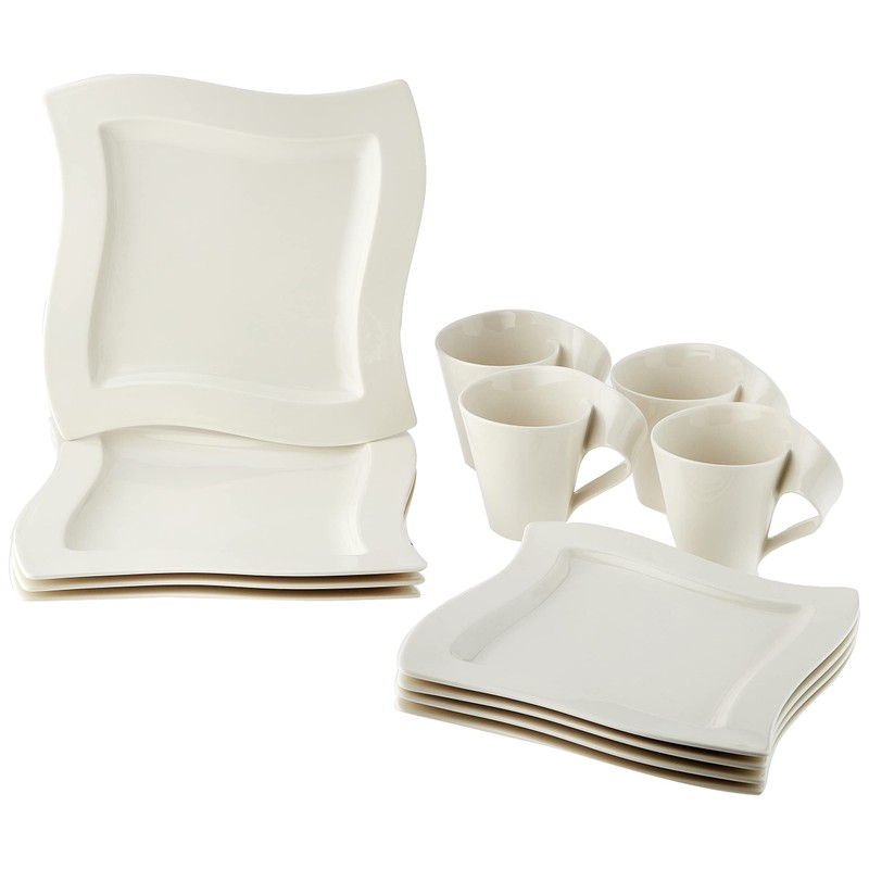 The New Wave collection of premium porcelain adds fluidity and style to your dinnerware with clean lines and original eye-catching designs. This place setting provides service for two and includes four each of the following: dinner plate, salad plate, and mug. Earn yourself a little more leisure time with dishwasher safe durability and microwave safe convenience. Made in Germany, the dinnerware set is securely packaged to ensure years of entertaining and enjoyment.