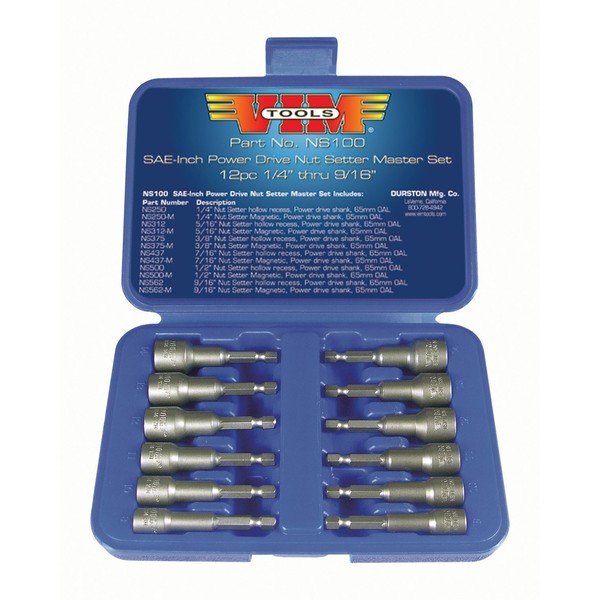 Vim Tools NS100 12-Piece SAE Power Drive Nut Setter with Magnetic and Hollow Point Drivers