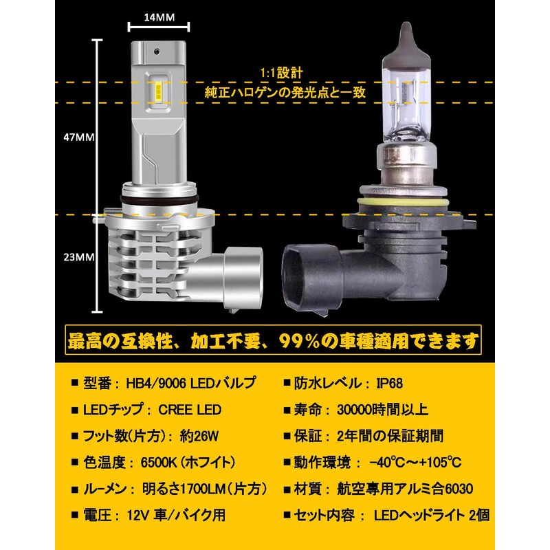 - Product Name: LED Headlight; Shape: HB4/9006; Chip: CREE LED Chip; Number of Kelvins: 6500K White; Compatible Voltage: 12V Car LED Headlight; Illumination Angle: 360° Luminescence; Life: Approx. 30,000 hours or more; Operating Environment: -40° to +105°C; Set Includes: 2 headlights; Note: Only for vehicles with original headlights HB4/9000 Fitment When using with an external car or some domestic vehicle, there may be cases of misoperation such as the indicator light or warning light. In such cases, please use the LED headlight indicator and non-light prevention unit (canceller) for use