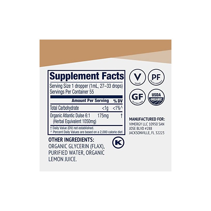 - PEACE OF MIND CLEAN. Vimergy Atlantic Dulse is a powerful liquid superfood product* that's paleo-friendly, Vegan, Gluten-Free, Kosher and USDA Organic. It's formulated without unnecessary sugars, binders or additives.