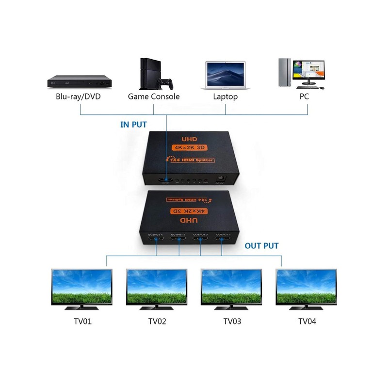 Vimi Splitter para Conexiones Tipo HD(MI) 1x4 HD 1 Entrada 4 Salidas Divisor De Señal 2k 4k 3D Conecta 4 TV Simultaneas