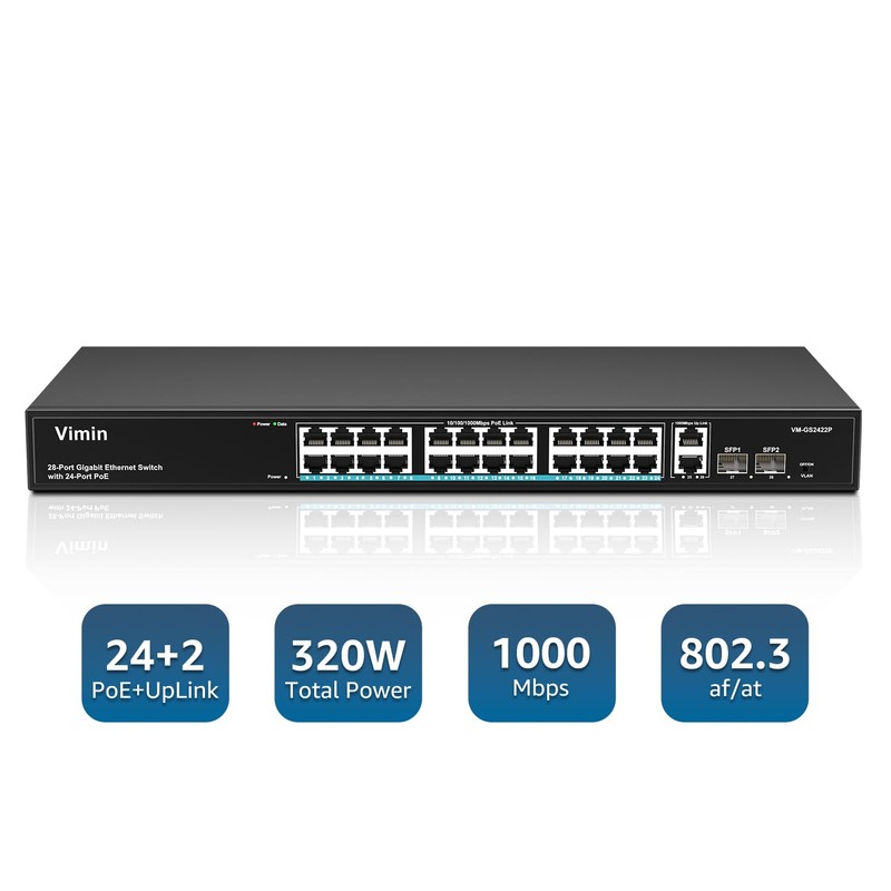 VIMIN 24 Port Gigabit PoE Switch with 2 Uplink Gigabit & 2 SFP Ports, 24-Port Ethernet PoE Switch Unmanaged w/ 320W High Power, Support IEEE802.3af/at, VLAN, Rack-Mount, Sturdy Metal Housing
